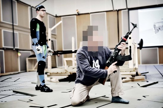 McNab 也同時與 DICE 的團隊一同工作以確保玩家能夠在單人劇情模式、合作模式與多人連線模式中體驗到真實且堅忍不拔的現代戰爭。下圖你可以看到 McNab 指導我們的動作捕捉演員如何在《戰地風雲3》內移動與表現得像是個真正的士兵。