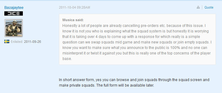 在上圖官方人員於 Battlelog 的回覆中也提到,包含在小隊介面中瀏覽小隊清單、加入小隊、將小隊上鎖不開放外人加入這些小隊管理功能將會在正式版推出。