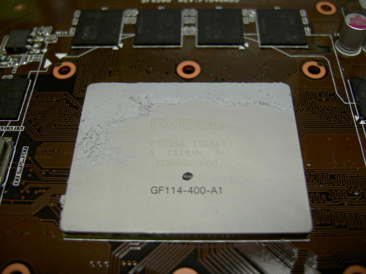 驗明正身,可以看到繪圖處理器型號為 GF114-400-A1,記憶體顆粒上的字已經糊掉照片拍不出來,仔細檢查後確認型號為 SAMSUNG K4G10325FE-HC04 0.4ns GDDR5,每一顆有 128 MB(1 Gbit)容量和 32 bit 匯流排頻寬,共 8 顆組成 1 GB 容量和 256 bit 頻寬。