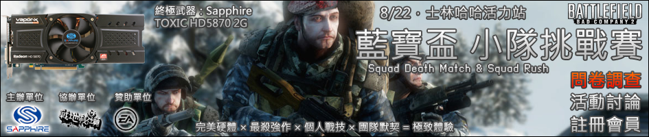 【年度站聚】戰地秘境藍寶盃《戰地風雲:惡名昭彰2》小隊挑戰賽 8 月 22 日士林哈哈狂熱開戰作者 小鴨 DUcK, 2010-07-19 |